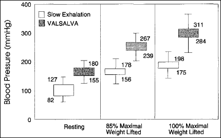 Tijdens setjes loopt de bloeddruk behoorlijk op. Houd je je adem in - officiële term: closed glottis Valsalva - dan neemt de bloeddruk nog verder toe. Veel verder. De tabel hieronder vertelt de bloeddruk bij verschillende krachtsporters tijdens de sets, terwijl ze doorademen en als ze hun adem inhouden. Het is, ehm, griezelig.