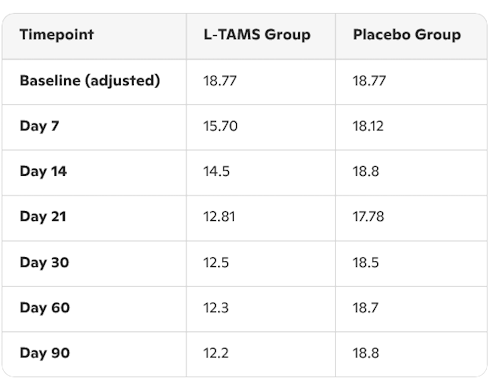 In de placebogroep bleef de score tijdens de trial moderately severe. In de experimentele groep zakte de score van moderately severe naar moderate.