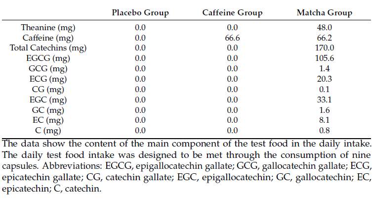 Proefpersonen in de experimentele groep kregen ten slotte dagelijks een supplement met 2070 milligram matchapoeder. In dat supplement zat onder meer 66 mg caffeïne, 48 milligram L-theanine en 105 milligram EGCG.