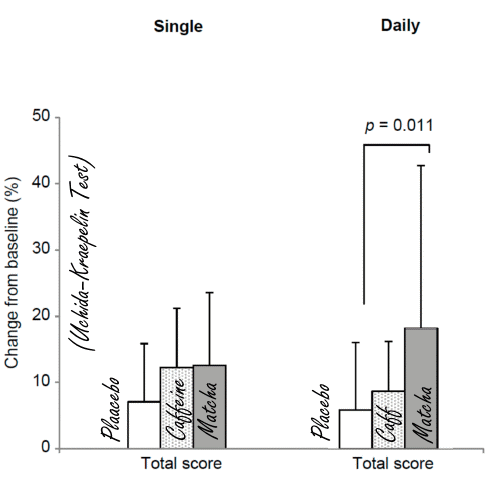 Suppletie met matcha zorgde voor verbetering van de gemiddelde score op de Uchida-Kraepelin Test met een slordige 15 procent. Dat is vergelijkbaar met een effectgrootte die je ziet bij cognitieve training.