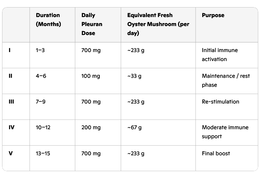 Aan de hand van een publicatie over de extractie-procedure van pleuran [Molecules. July 2019;24(15):2740.] hebben we de doses met een beetje natte vingerwerk omgerekend naar verse oesterzwammen.