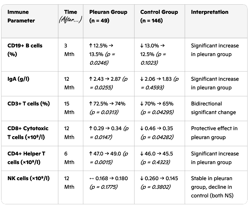 Voor het afremmen van kanker zijn vooral de CD8+ cytotoxische T-cellen, de NK-cellen en de CD4+ Th1-cellen relevant. Pleuran stimuleerde ook deze drie immuunceltypes.