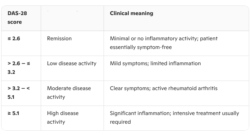 De laagste score op de DAS-28 is 0, de hoogste 9.4.