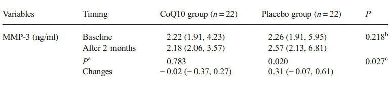 Bij beide groepen daalde de DAS-28-score statistisch significant, maar de daling in de placebogroep stelde weinig voor. In de Q10-groep daarentegen daalde de DAS-28-score met 53 procent.