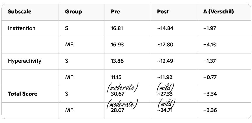 Omdat de doorsnee-proefpersoon in deze pilot study aanvankelijk een score van 28-31 had, zakten de scores in beide groepen onder de 28. En dat is toevallig nou net het cut off point waar een matige vorm van ADHD overgaat in een milde.