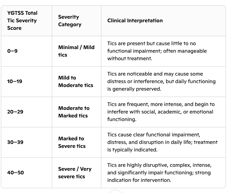 De tabel hieronder laat zien hoe je YGTSS-scores moet interpreteren. Klik erop voor een grotere versie.