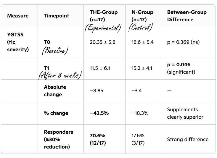 In de experimentele groep zakte de gemiddelde score met 44 procent. Die afname was wel degelijk statistisch significant. De ernst van de tics nam bovendien af van 'matig' naar 'mild'. De afname was dus niet alleen statistisch, maar ook klinisch significant.