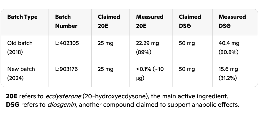 Behalve ecdysteron bevatte het supplement ook diosgenine. Het label vermeldde 50 milligram, maar de onderzoekers vonden nog geen 16 milligram.