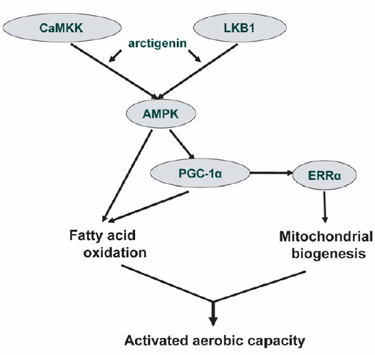 In de quadriceps van de muizen die arctigenin hadden gekregen vonden de onderzoekers de bovenstaande aanwijzingen voor een verhoogde mitochondriale biogenese. Een schema dat aangeeft hoe arctigenin ongeveer zou moeten werken zie je hier. Conclusie "Our results have provided additional understanding of pharmacological functions for arctigenin and the traditional Chinese medicine Arctium lappa, and suggested the potential of arctigenin as a lead compound for anti-obesity or anti type 2 diabetes drug discovery." Bron: Meer: