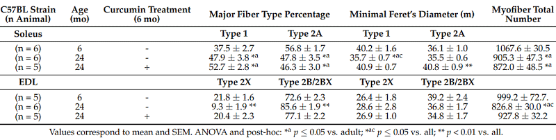De grafiek hierboven heeft betrekking op C57BL10ScSn-muizen. De onderzoekers experimenteerden ook met C57BL6J-muizen, en ook in die proefdieren verlengde curcumine de levensduur. Tegelijkertijd verminderde curcumine het verlies van spiermassa door het verouderingsproces. Toen de muizen 24 maanden oud waren, voorkwam curcumine de afname van het aantal snelle type-2-spiervezels in de extensor digitorum longus [EDL], een spiergroep met veel sterke en snelle spiervezels. Ook de tabel hieronder heeft betrekking op C57BL10ScSn-muizen. Klik erop voor een grotere versie.