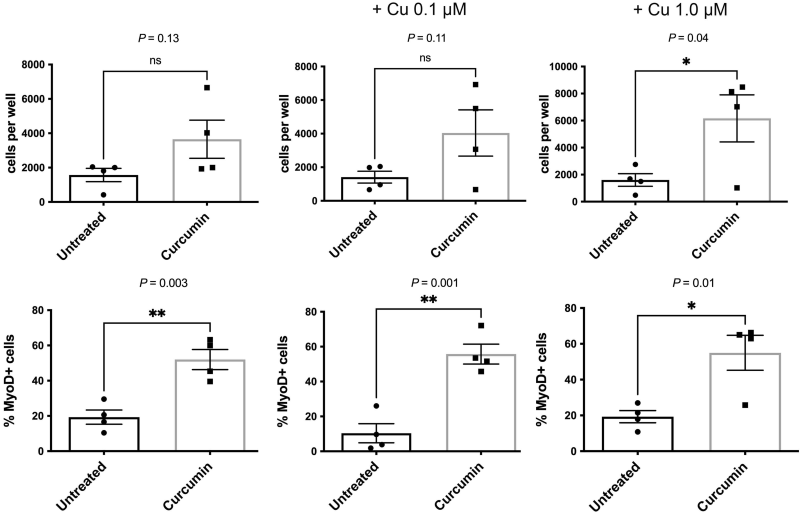 Hoe curcumine spieren beschermt tegen veroudering, vertelt de figuur hierboven. De onderzoekers beschadigden spierweefsel van de muizen, lieten het herstellen, en keken vervolgens hoeveel stamcellen ze in de weefsels vonden. Curcumine vergrootte het aantal stamcellen in de herstellende spieren. De effecten van suppletie werden sterker als de onderzoekers de spiercellen ex vivo nog eens blootstelden aan curcumine. Klik op de figuur voor een grotere versie.