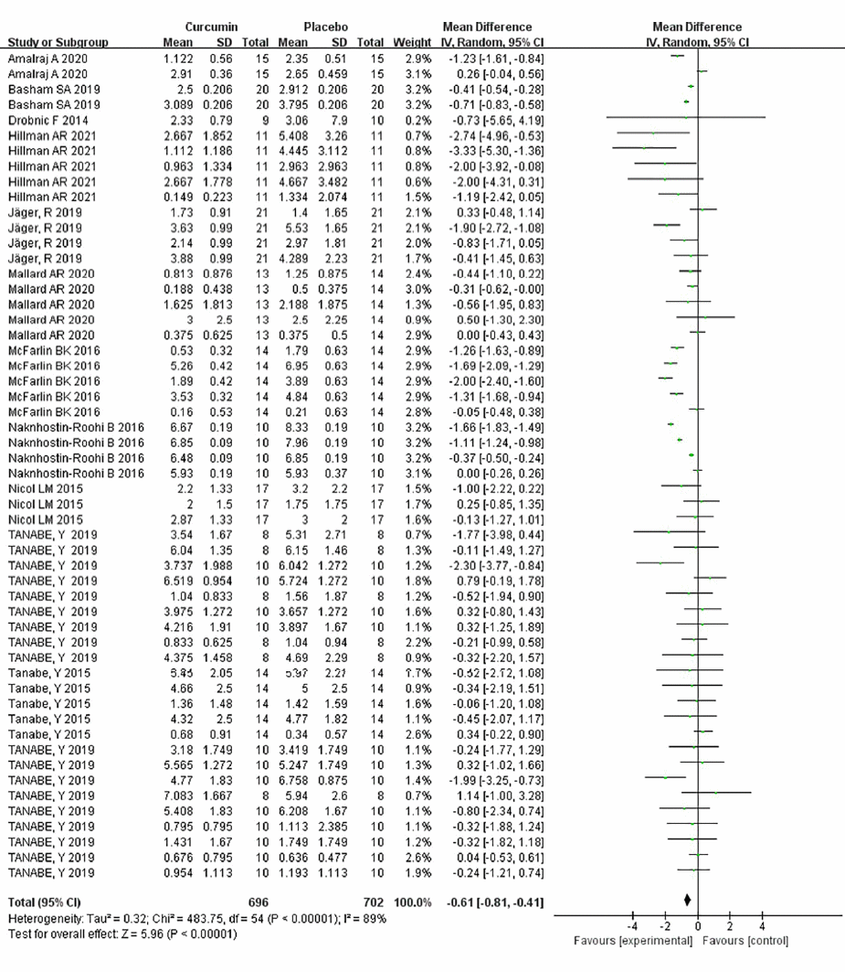 De onderzoekers keken onder meer naar het effect op spierpijn. De figuur hieronder laat zien dat suppletie met curcumine die spierpijn significant verminderde.