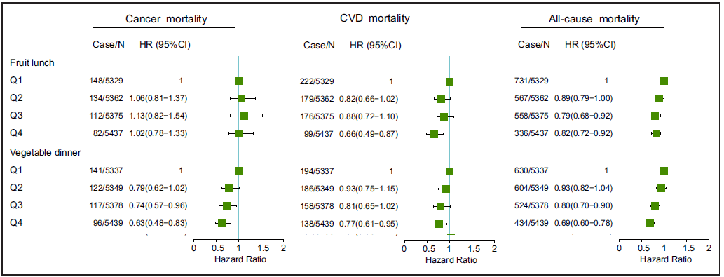De figuren hieronder vatten de uitkomsten nog eens samen. De onderzoekers berekenden de positieve en negatieve effecten door de studiedeelnemers in het hoogste kwartiel te vergelijken met de studiedeelnemers in het laagste kwartiel. Ze vergeleken bijvoorbeeld de 25 procent van de studiedeelnemers die de meeste groenten bij het avondeten consumeerden met de 25 procent van de studiedeelenemers die de kleinste hoeveelheid bij het avondeten consumeerden.
