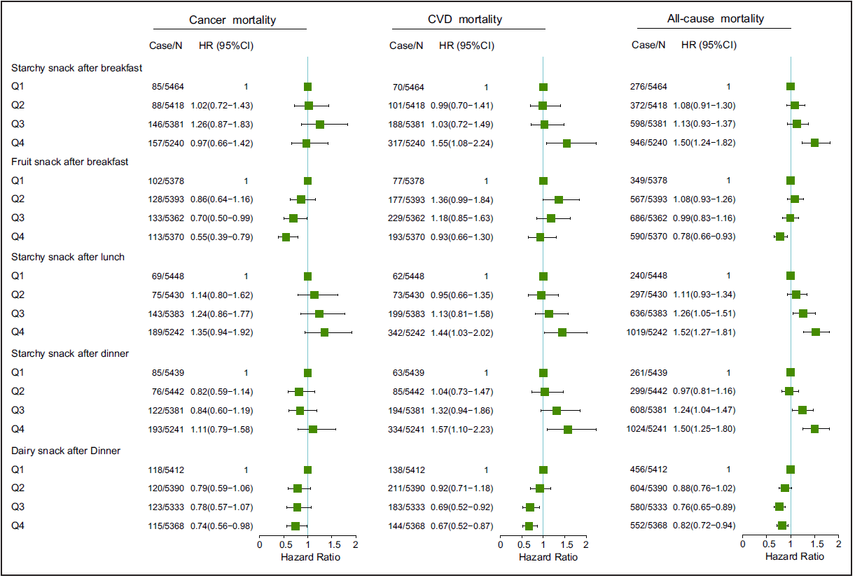 De onderzoekers keken ook naar snackgewoonten. Studiedeelnemers die na het ontbijt snackten met fruit, en na de grote maaltijd snackten met zuivel, verlaagden hun kans op overlijden. Snacks met zetmeel - zoals chips en koekjes - verhoogden daarentegen de kans op overlijden. Het maakte niet uit na welke maaltijd de studiedeelnemers die snacks consumeerden; starchy snacks waren altijd ongezond. Klik op de figuur hieronder voor een grotere versie.