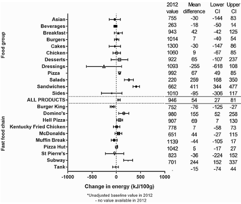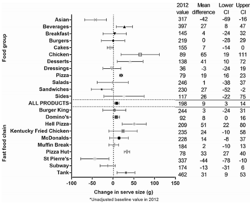 In de bestudeerde periode werden de porties een beetje groter, [Figuur] en gingen de producenten nog een beetje meer vet en suikers gebruiken - waardoor de hoeveelheid energie per gram fast food verder toenam. [Figuur]