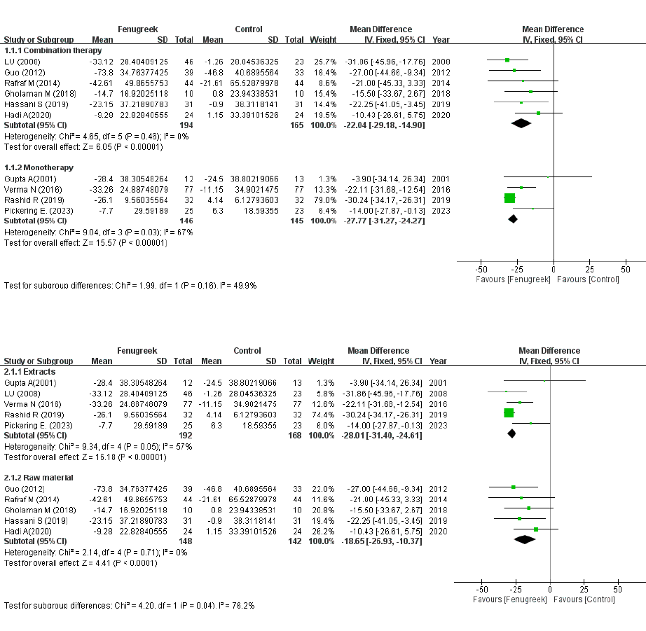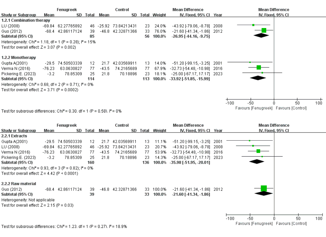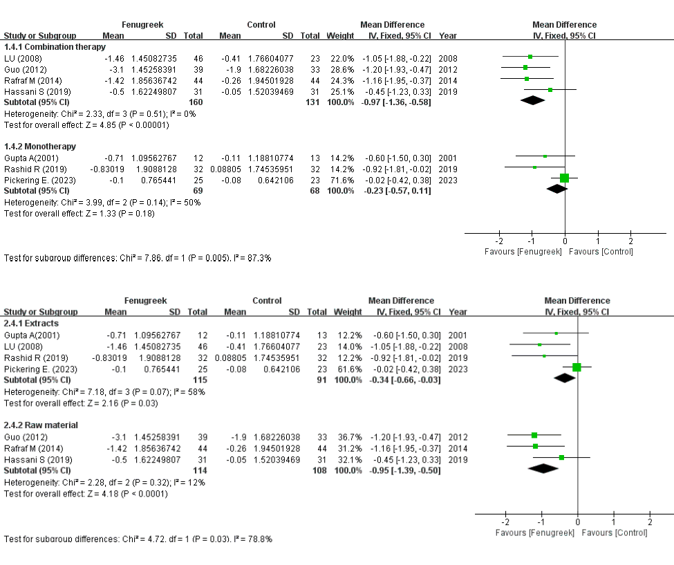 In een aantal trials bestudeerden de onderzoekers het effect van fenegriek alleen, in andere de toegevoegde waarde van fenegriek in combinatie met andere interventies, zoals medicatie of beweging.