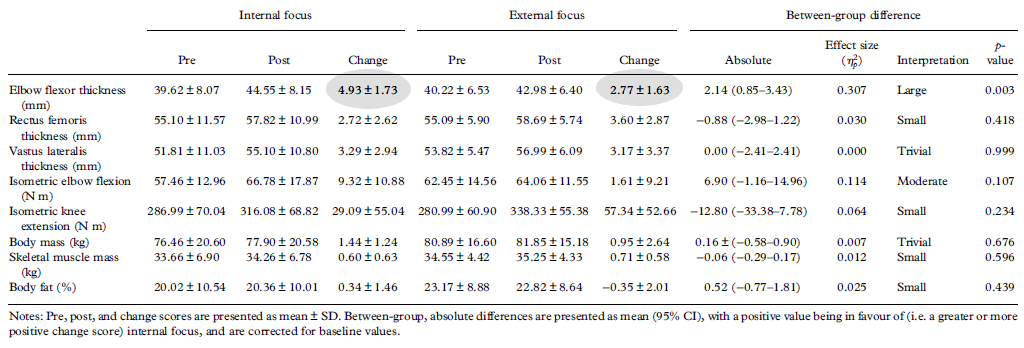 De proefpersonen die zich tijdens hun workouts hadden geconcentreerd op hun spieren [Internal focus] hadden hun biceps meer laten groeien dan de proefpersonen die zich tijdens hun training hadden geconcentreerd op het gewicht [External focus].