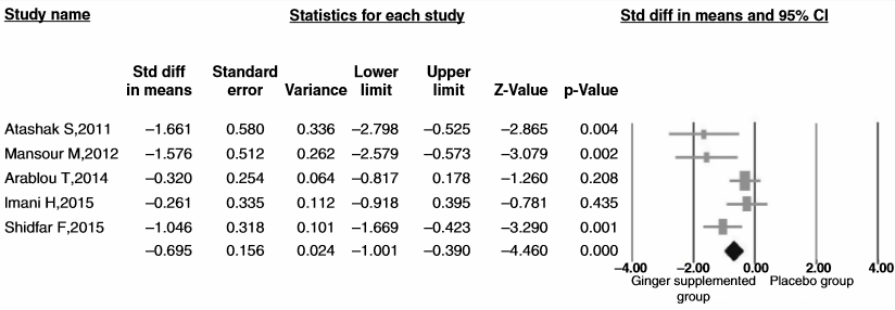 De onderzoekers traceerden 9 deugdelijke trials waarin proefpersonen gemberpoeder hadden gekregen. Ze veegden de uitkomsten bijelkaar, en analyseerden die opnieuw.