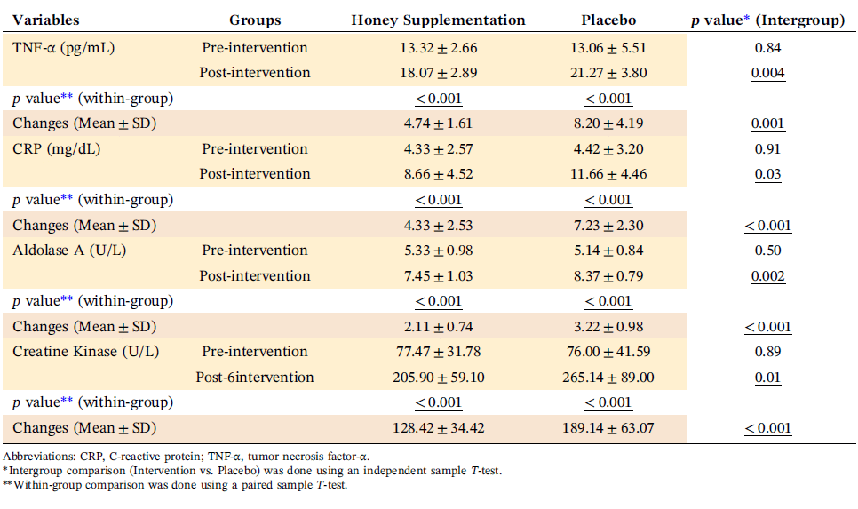 Na 6 weken suppletie waren de waarden in de honinggroep echter significant lager dan in de placebogroep. Kennelijk had de suppletie met honing de stijging afgeremd.