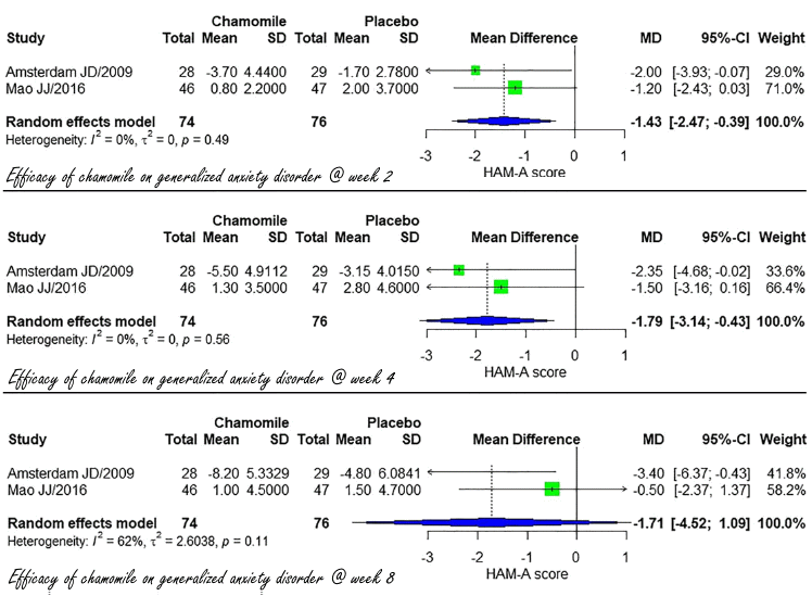 Metastudie In de meeste trials kregen de proefpersonen kamille-extracten oraal toegediend. De doses varieerden van twee doses van 220 milligram per dag tot dagelijks drie doses van 500 milligram, maar waren ook trials waarin proefpersonen werden behandeld met topicals of inhaleerbare vluchtige olie uit kamille. De duur van de trials varieerde van 2 tot 26 weken. De Vietnamezen veegden de uitkomsten samen en analyseerden die opnieuw. Resultaten 6 trials keken naar het effect van kamille op de slaapkwaliteit. Uit die trials bleek dat kamille een positief effect had. Klik op de figuren hieronder voor een grotere versie. In een aantal trials keken de onderzoekers naar het effect op bezorgdheid en angst. Daar kwam niets uit. In een paar studies keken de onderzoekers specifiek naar generalized anxiety disorder. Dat houdt in dat je jezelf langdurig en oncontroleerbaar zorgen maakt over irrationele zaken. Uit die trials bleek dat kamille gedurende 2-4 weken zou kunnen werken. Conclusie "Chamomile appears to be a relatively safe herb for the improvement of sleep quality and generalized anxiety disorder in the short term", concluderen de Vietnamezen. Bron: Meer:
