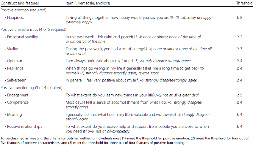 De Nieuw-Zeelanders legden aan de studiedeelnemers een vragenlijst voor, die meet hoe positief ze in het leven staan. Optimal wellbeing, noemen de onderzoekers het, en dat is breder dan geluk. Onder optimal wellbeing valt volgens de onderzoekers ook bijvoorbeeld het hebben van zinvolle relaties, een positief zelfbeeld, emotionele stabiliteit, optimisme, het leren van nieuwe vaardigheden of het besef dat je elke dag iets bijzonders presteert.