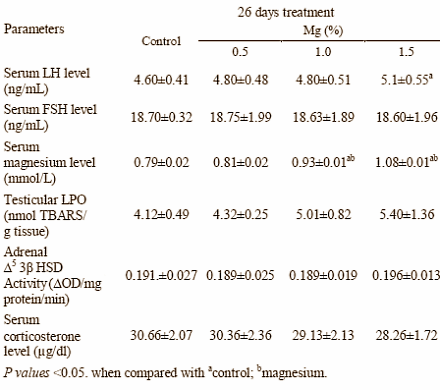 De fikse doses magnesiumsulfaat hadden geen effect op de zaadkwaliteit. De concentratie TBARS - een merker voor de activiteit van vrije radicalen - steeg, maar niet significant. Vrije radicalen verhogen in fundamentele studies de afgifte van stresshormonen door de bijnier, maar de onderzoekers konden geen effect op de concentratie corticosteroidhormoon ontdekken.
