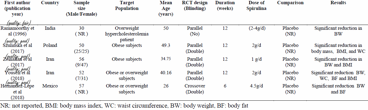 De onderzoekers traceerden in wetenschappelijke literatuur deugdelijke 5 studies waarin zwaarlijvige proefpersonen supplementen gedurende 6-12 weken met 1-4.5 gram spirulina per dag hadden gekregen - en waarin de onderzoekers vervolgens het effect van de suppletie op het lichaamsgewicht hadden bepaald.