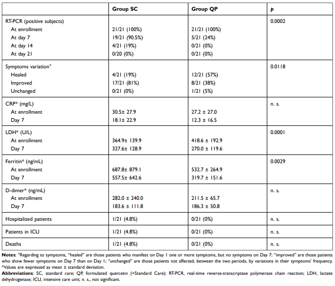 Resultaten Na 7 dagen was in de controlegroep nog 90 procent van de proefpersonen volgens een PCR-test nog positief. In de quercetine-groep was dat slechts 24 procent. Toen de 2 weken voorbij waren, was in de controlegroep 19 procent genezen. In de quercetine-groep was dat 57 procent. Klik op de tabel hieronder voor een grotere versie.