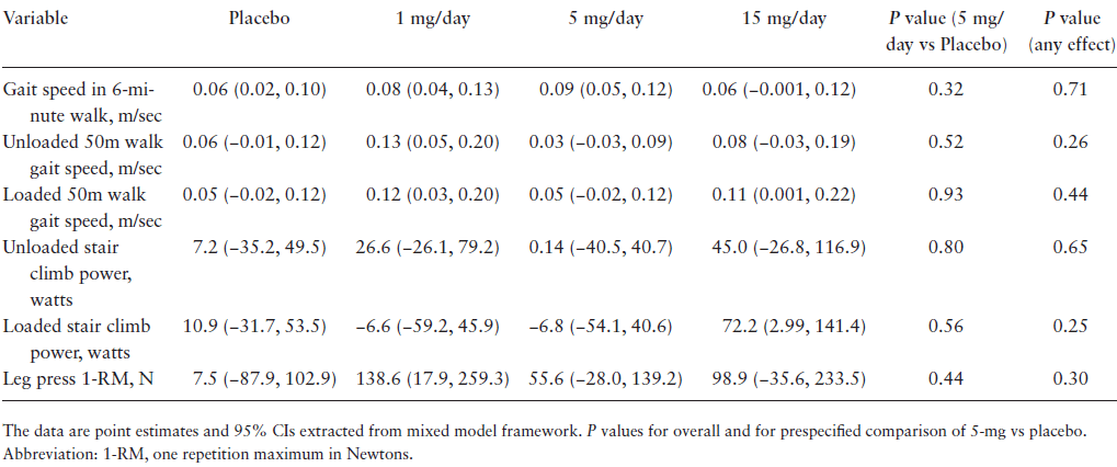 De 15 milligramdosis leek ook de prestaties op de stair-climber en de leg-press te verbeteren, maar de toename was niet statistisch significant. Klik op de tabel hieronder voor een grotere versie.