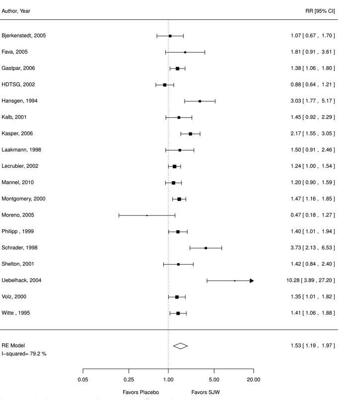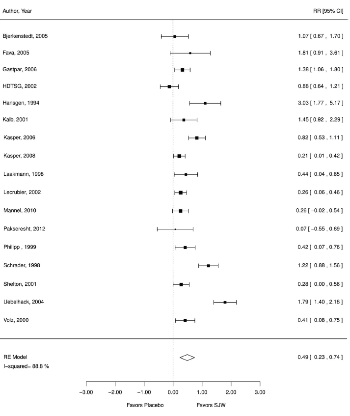 Studie In de studies gebruikten onderzoekers doses die bijna altijd ergens tussen 500-1200 milligram extract per dag lagen. De proefpersonen verdeelden die doses over 2-3 innamemomenten per dag. De extracten die de onderzoekers het meest frequent gebruikten bevatten 0.3 procent hypericine en 1-4 procent hyperforine. De proefpersonen kregen geen andere middelen. Resultaten Klik op de figuren hieronder voor een grotere versie. De depressiescores namen bij de gebruikers van Sint Janskruid significant meer af dan bij de proefpersonen die een placebo kregen. Dat vertelt de figuur hierboven. Volgens de meta-gegevens van Apaydin verdween de depressie iets vaker bij proefpersonen in de suppletiegroep dan bij proefpersonen die een placebo kregen, maar dat verschil was niet significant.