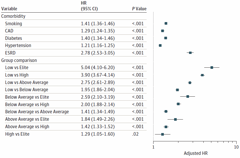 Roken verhoogde uiteraard de kans op overlijden, ontdekten de onderzoekers. Roken was ongeveer net zo'n grote risicofactor als diabetes, een hoge bloeddruk en hart- en vaatziekten [CAD]. Nog meer risico op overlijden hadden de studiedeelnemers met end-stage renal disease.