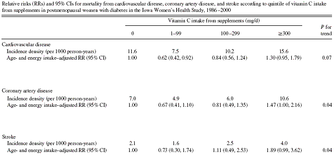 Design We studied the relation between vitamin C intake and mortality from total cardiovascular disease (n = 281), coronary artery disease (n = 175), and stroke (n = 57) in 1923 postmenopausal women who reported being diabetic at baseline. Diet was assessed with a food-frequency questionnaire at baseline, and subjects initially free of coronary artery disease were prospectively followed for 15 y.
