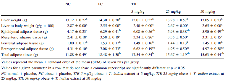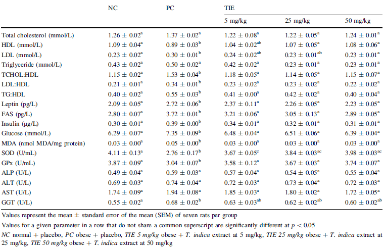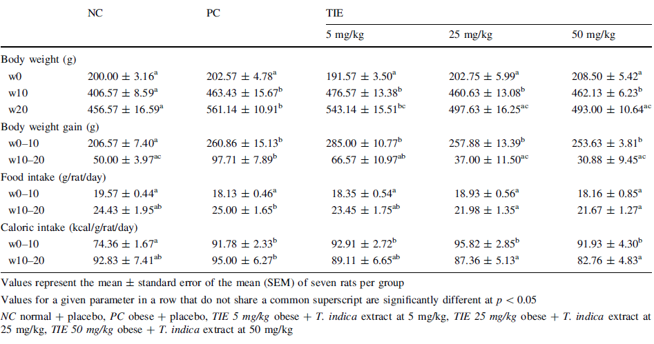 Studie Daarnaast waren er nog drie groepen ratten die behalve dikmakend voer ook een extract op waterbasis van het vruchtvlees van Tamarindus indica. Elk van deze drie groepen ratten kreeg een andere dosis. Als de ratten in de groep met de lichtste dosis [TIE 5 mg/kg] volwassen mensen waren geweest, dan hadden ze dagelijks ongeveer 150 milligram extract gekregen. Het humane equivalent van de hoogste dosis in deze dierstudie [TIE 50 mg/kg] was ongeveer anderhalve gram extract per dag. Resultaten Klik op de tabellen hieronder voor een grotere versie. Als je kijkt naar het effect op het lichaamsvet, dan heeft de middelste en de hoogste dosis extract een significant effect. Mechanisme Humaan onderzoek Uit die trial kwam niets. Misschien reageren mensen (diepe zucht) anders op de bioactieve stoffen in Tamarindus indica dan knaagdieren, schrijven de onderzoekers in de publicatie uit 2020. Of misschien hebben die stoffen geen effect als je ze in de vorm van vruchtvlees binnenkrijgt. Dat laatste is helemaal niet zo'n rare gedachte. De vruchten van de tamarinde bevatten behoorlijk veel koolhydraten. Bron: Meer: