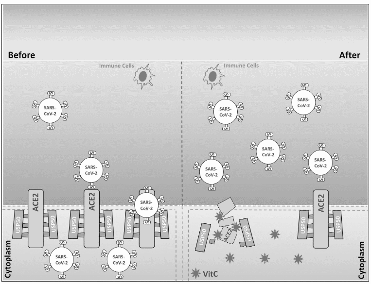 Omdat ze meer wilden weten, deden de onderzoekers experimenten met muizen. Ze stelden die niet alleen bloot aan vitamine C, maar ook aan versleutelde virussen. Aan die virussen hadden de onderzoekers het spike-eiwit van SARS-CoV-2 geplakt. Via dat spike-eiwit plakt SARS-CoV-2 zich vast aan de ACE-2-receptor waarna het cellen kan binnendringen.