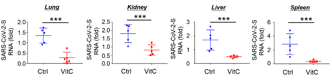 De figuren hierboven laten zien dat vitamine C niet alleen in de longen, maar ook in de nieren, lever en milt infectie kon verminderen. Klik op de figuren voor een grotere versie.