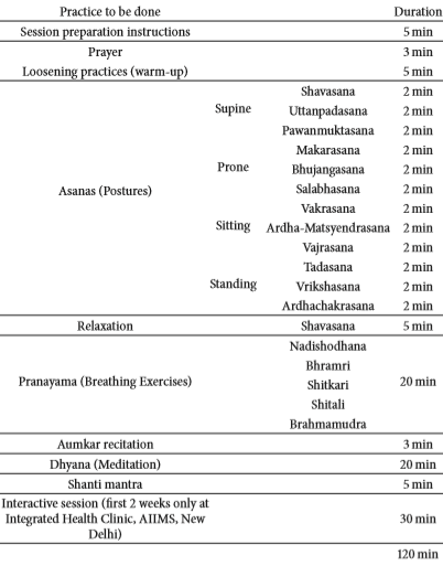 Gedurende 12 weken moesten de proefpersonen 5 dagen per week een yogasessie afwerken van 120 minuten. Details over de sessie zie je hieronder. Klik op de figuur voor een grotere en leesbare versie.