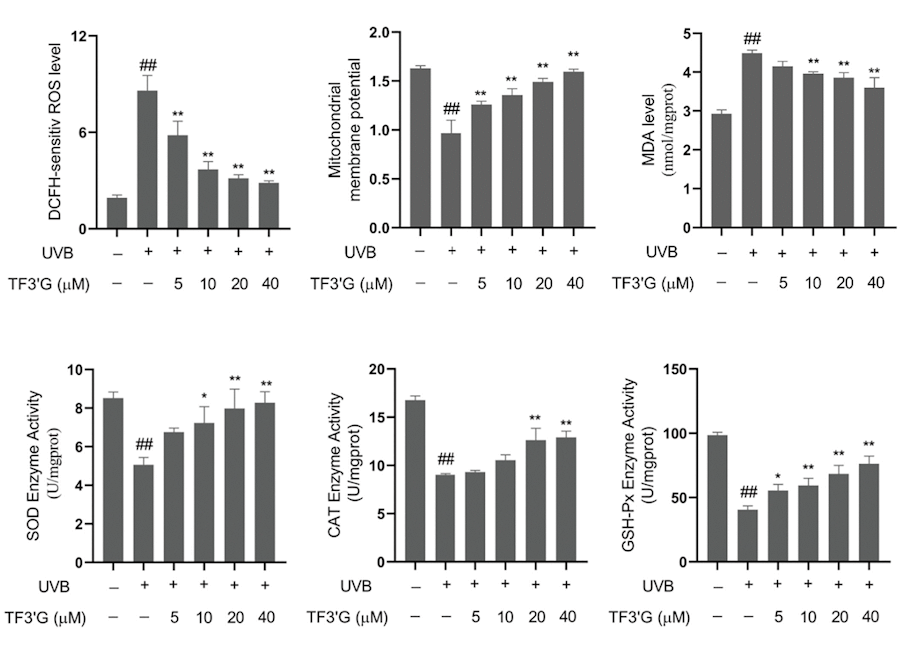 Daarnaast vermindert theaflavine-3'-gallaat, tijdens blootstelling aan UVB, functieverlies van de mitochondria en de activiteit van beschermende endogene enzymen als catalase en SOD.