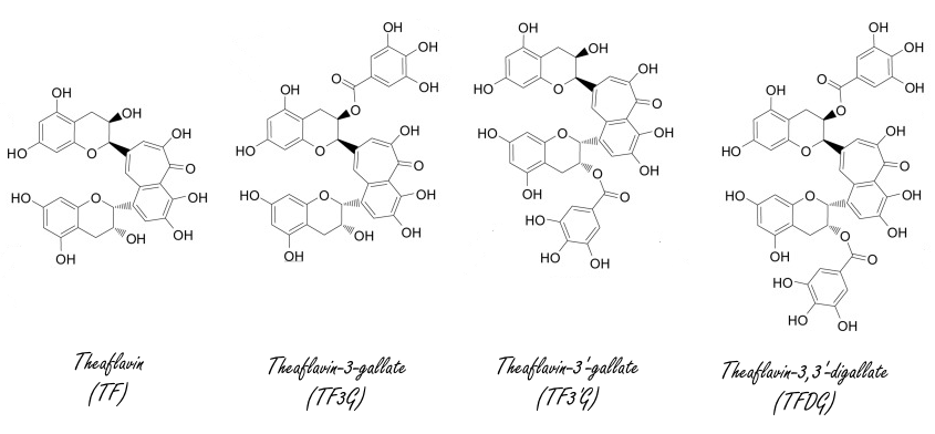 De onderzoekers testten 4 theaflavines. Je ziet ze hieronder. Klik op de figuur voor een grotere versie.